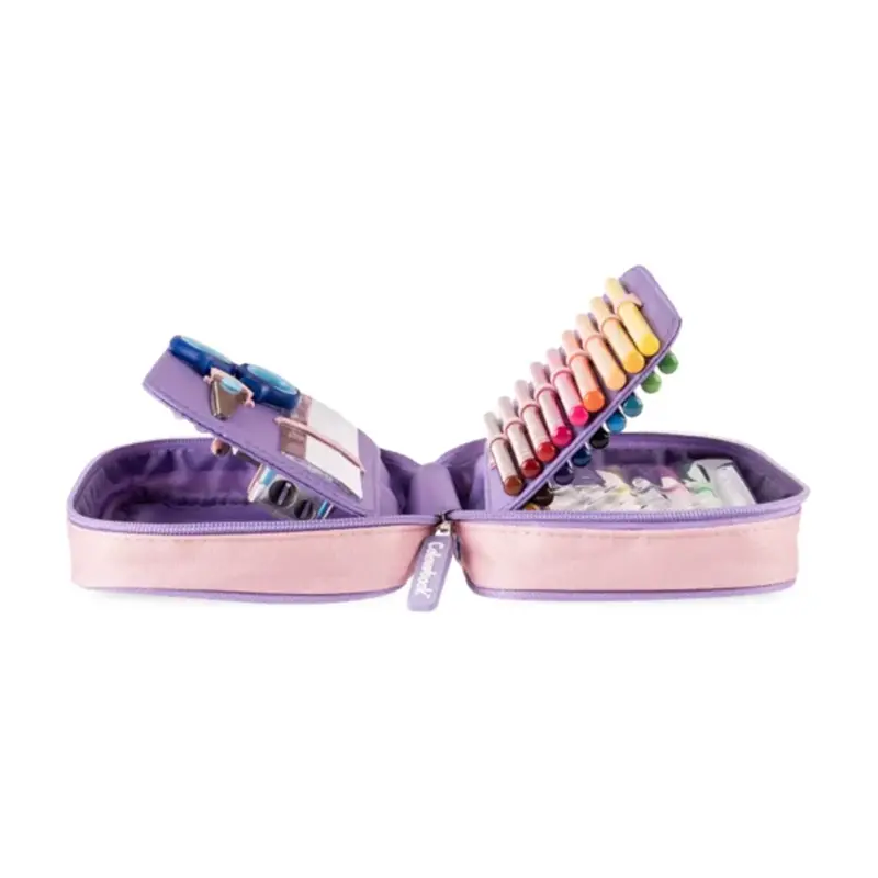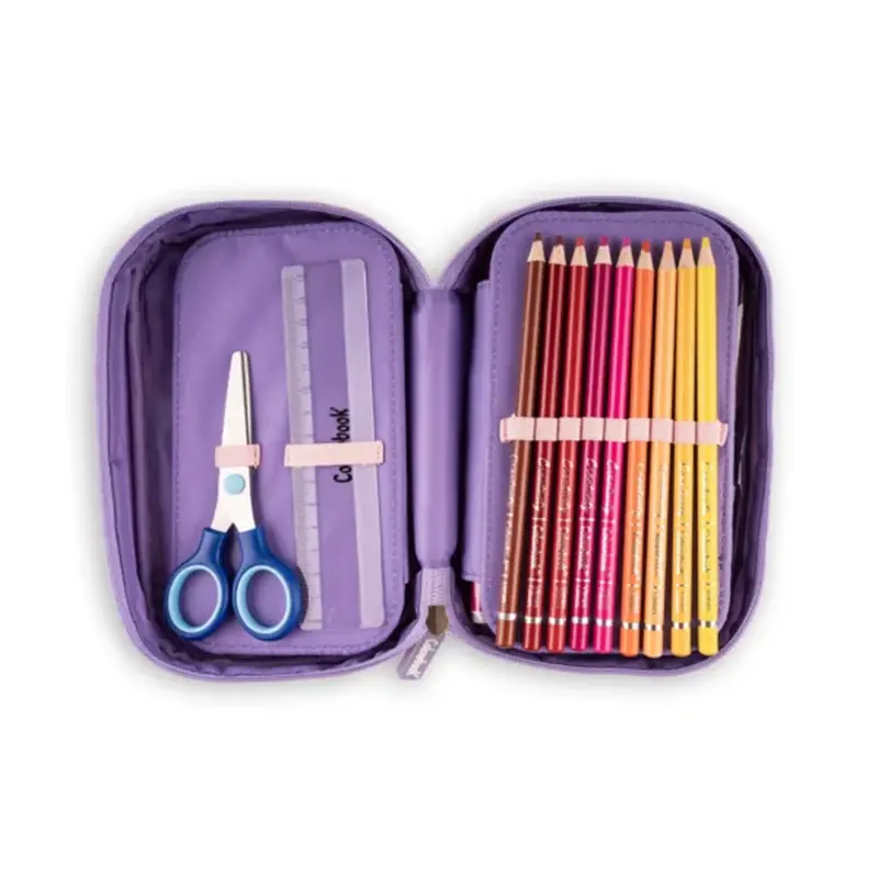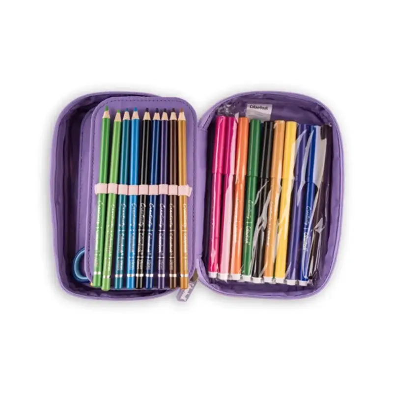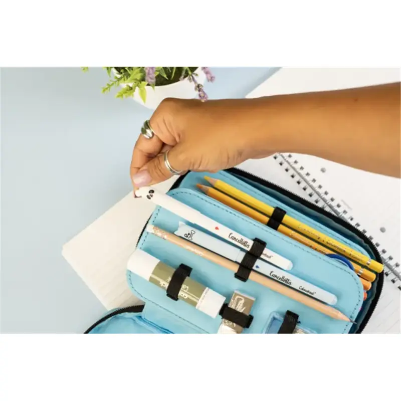 Un mondo di colori, per davvero, con l’astuccio con zip hai tutta la cancelleria scuola in un unico acquisto. L’astuccio Abstract ha la pattina portapenne con elastici passanti che tiene la cancelleria al sicuro. Al suo interno troverai: