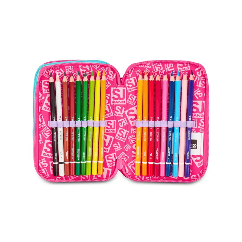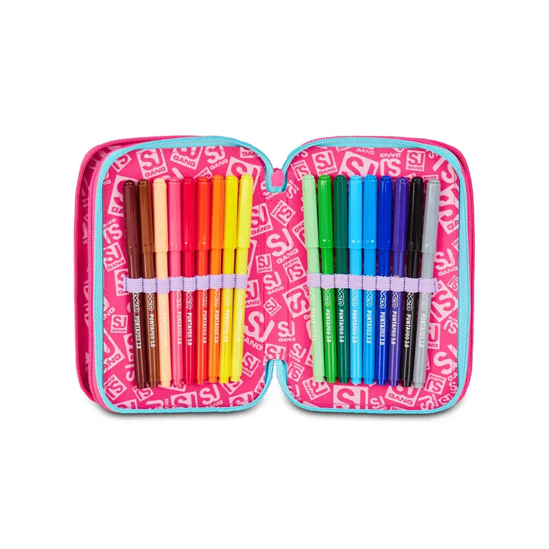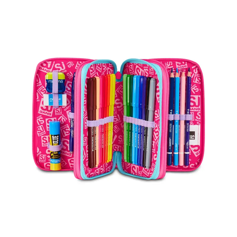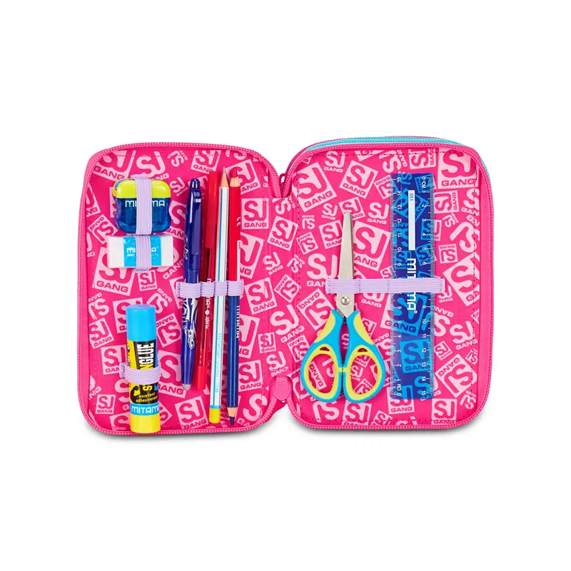 CONTENUTO 45 PEZZI: 1 penna cancellabile blu Frixion, 1 penna sfera rossa, 18 pastelli a colore MINAPRO 4.0, 18 pennarelli PUNTAPRO 3.0, 1 matita grafite esagonale HB, 1 colla gialla azzurra, 1 gomma bianca con cartoncino stampato, 1 temperino barilotto 2 fori, 1 righello trasparente, 1 matita bicolor rosso/BLU, 1 paio di forbici in metallo