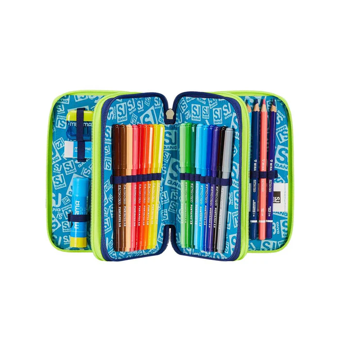 Sono il coloratissimo Astuccio 3 zip SJ Gang. Dotato di 3 scomparti completi di tutto il materiale necessario per fare al meglio i tuoi lavori di scuola