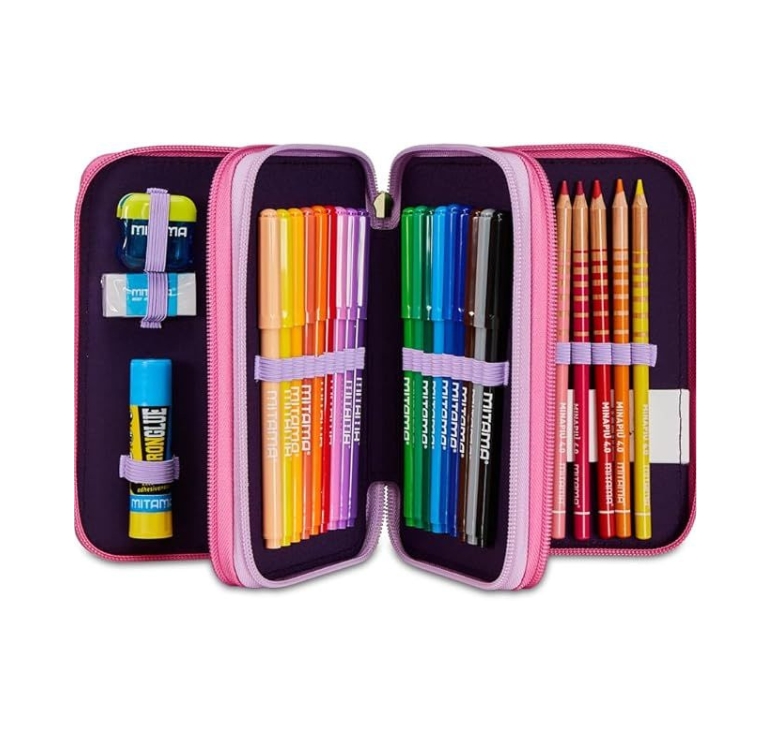 Sono il coloratissimo Astuccio 3 zip SJ Gang. Dotato di 3 scomparti completi di tutto il materiale necessario per fare al meglio i tuoi lavori di scuola