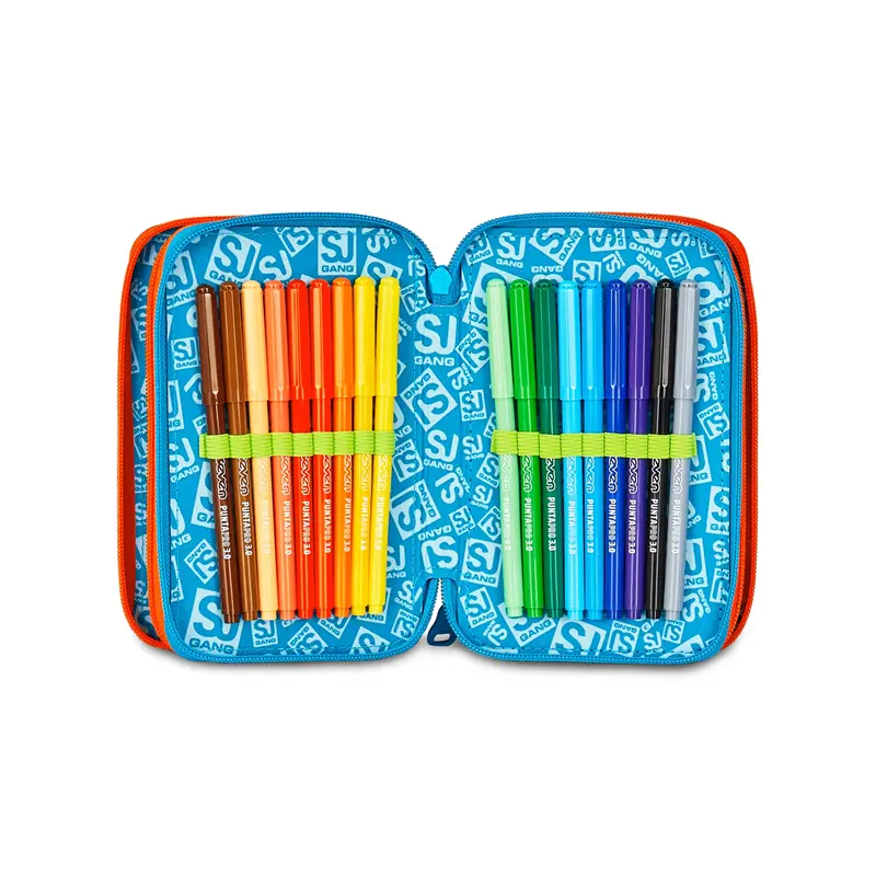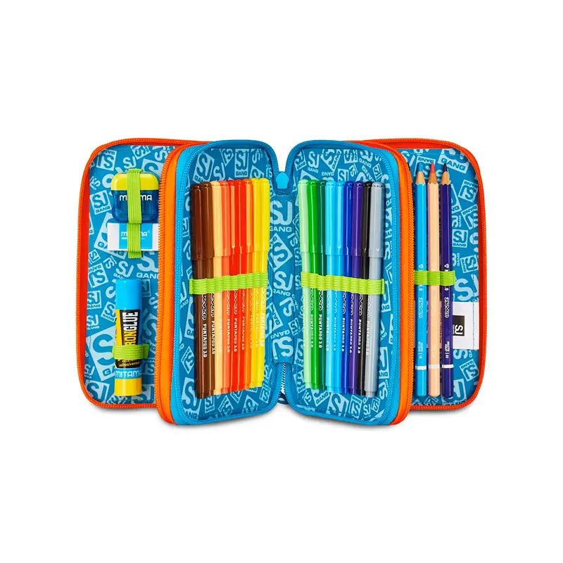 Ciao! Sono il coloratissimo Astuccio 3 zip SJ Gang. Dotato di 3 scomparti completi di tutto il materiale necessario per fare al meglio i tuoi lavori di scuola.