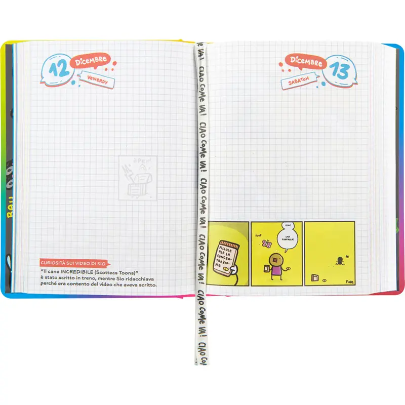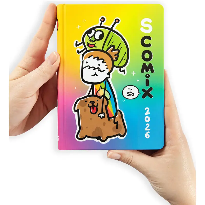 AGENDA COMIX SCOMIX BY SIO 16 MESI: questa agenda giornaliera copre il periodo dal 1° settembre 2025 al 31 dicembre 2026, è illustrato da Simone Albrigi, in arte Sio, un fumettista amatissimo dal pubblico che dà una visione umoristica e improbabile del mondo.