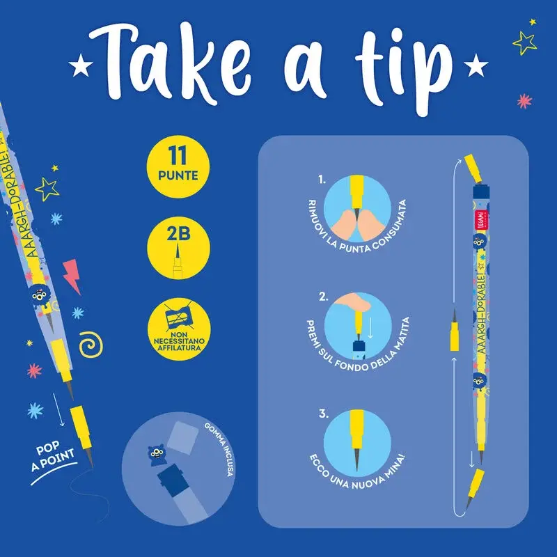 Vorresti che la tua matita si facesse in 4 per te? La Matita Impilabile con Gomma – Take a Tip – Monster di Legami fa di meglio: si fa letteralmente in 11 per essere sempre pronta senza bisogno di temperamatite. Colorata, divertente e super pratica è perfetta per i bambini e per la scuola.