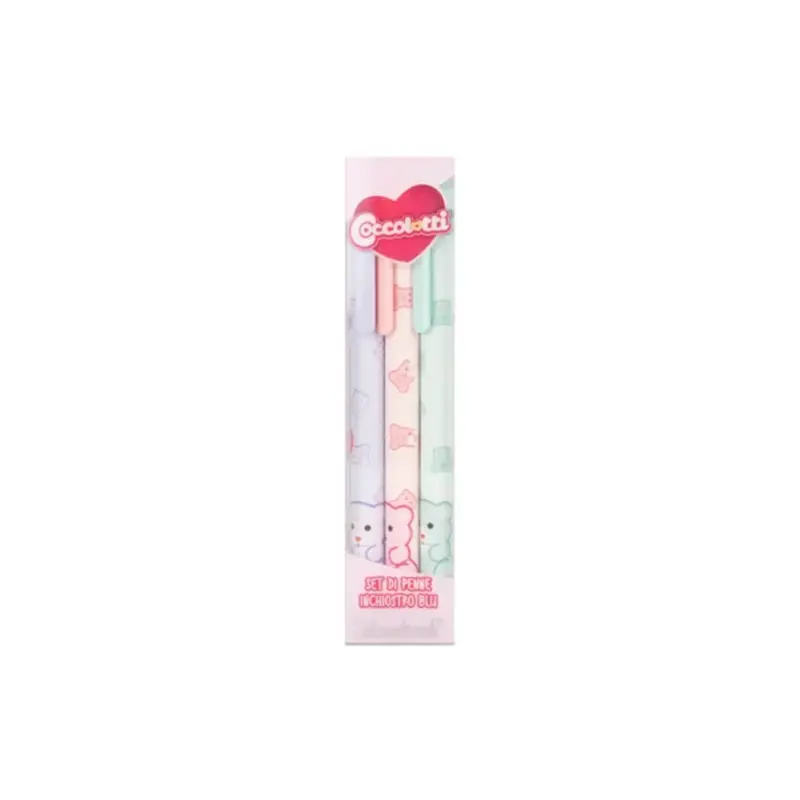 Scrivi i tuoi pensieri più dolci con il set di 3 penne a sfera con chiusura a scatto Coccolotti by Colourbook. 3 penne della collezione Coccolotti Classic con le iconiche grafiche dei celebri orsetti. Le penne sono tutte con inchiostro blu.