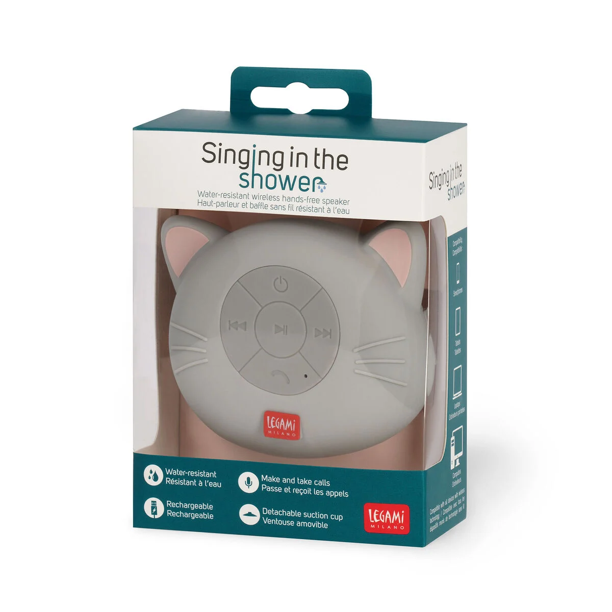 Nessuno può metterti in un angolo, soprattutto quando sei il protagonista di un musical sotto la doccia! Balla come se nessuno guardasse e canta come se i vicini fossero sordi con Singing in the Shower, il vivavoce e speaker Bluetooth® resistente all’acqua a tema Kitty di Legami! Puoi attaccarlo direttamente nel box doccia o alla vasca da bagno con la ventosa e lanciarti nella tua performance più superba. Grazie al microfono integrato potrai anche ricevere ed effettuare chiamate sotto la doccia: perfetto per le call che non finiscono mai!