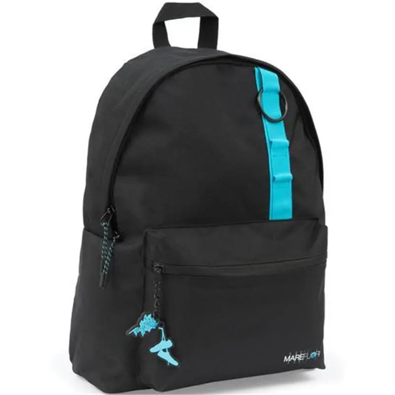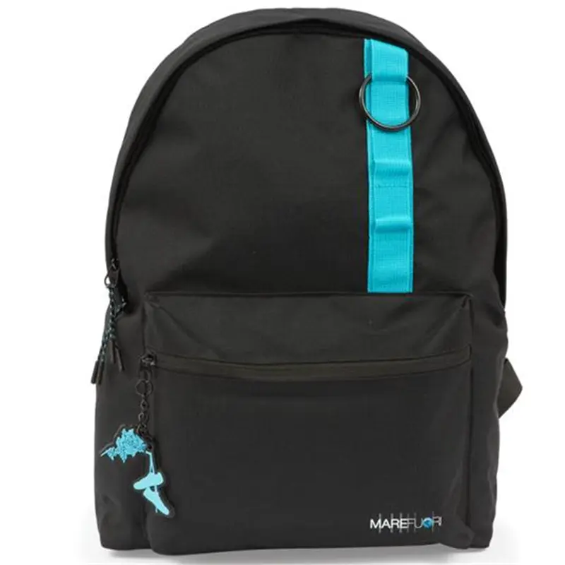 Zaino americano Mare fuori, con fascia in tessuto e anello in metallo, pendenti intercambiabili con moschettone e il logo in stampa serigrafica nella tasta frontale. Dimensioni dello ziano 40*23*18 cm e 23L.
