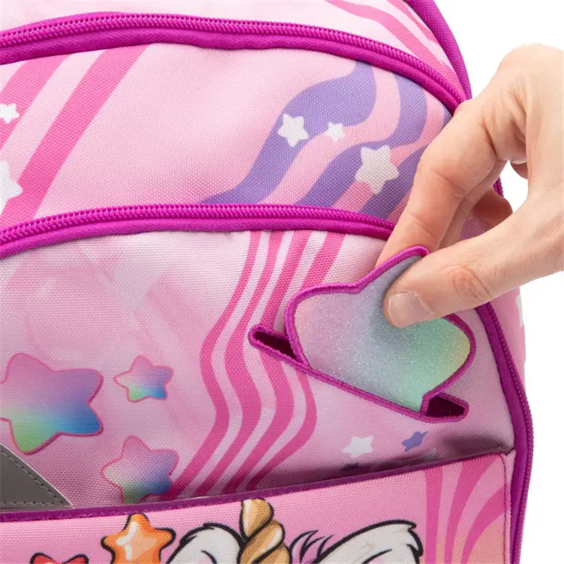 La fascia frontale removibile permette di cambiare look allo zaino con 3 grafiche intercambiabili. Un pop-up a forma di stella aggiunge un tocco di luce e magia.