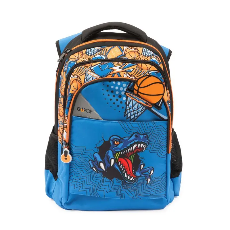 Scopri lo Zaino GoPop Slam Dunk, perfetto per la scuola e per gli amanti del basket! Con un design unico che vede un dinosauro raptor giocare a basket, questo zaino unisce divertimento e sport.